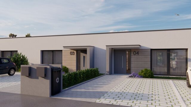 Domy jsou dispozičně řešeny jako 4+kk. Najdete zde 4 pokoje, prostorný obývací pokoj s kuchyňskou linkou, 2 dětské pokoje a velkou ložnicí se vstupem na terasu. Dále koupelnu, toaletu a úložné prostory.