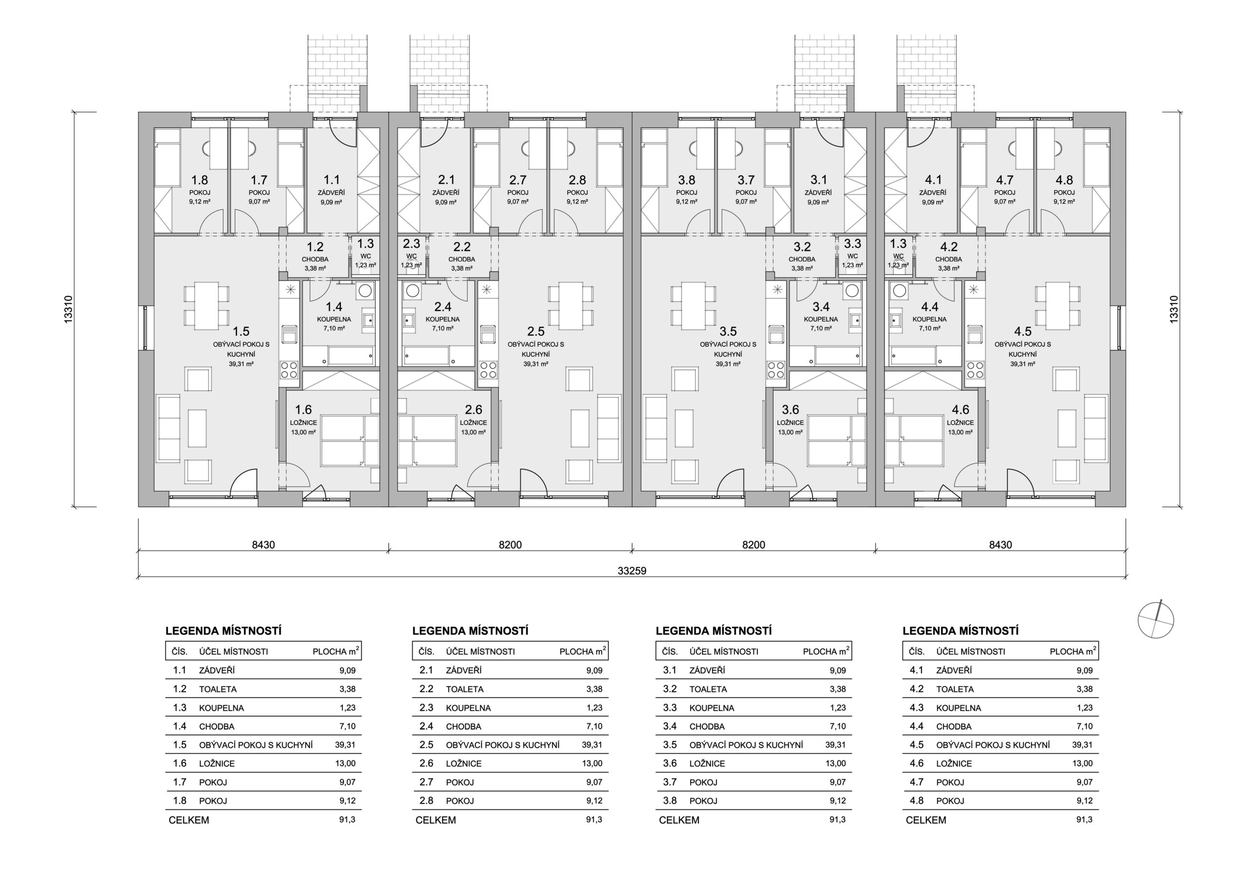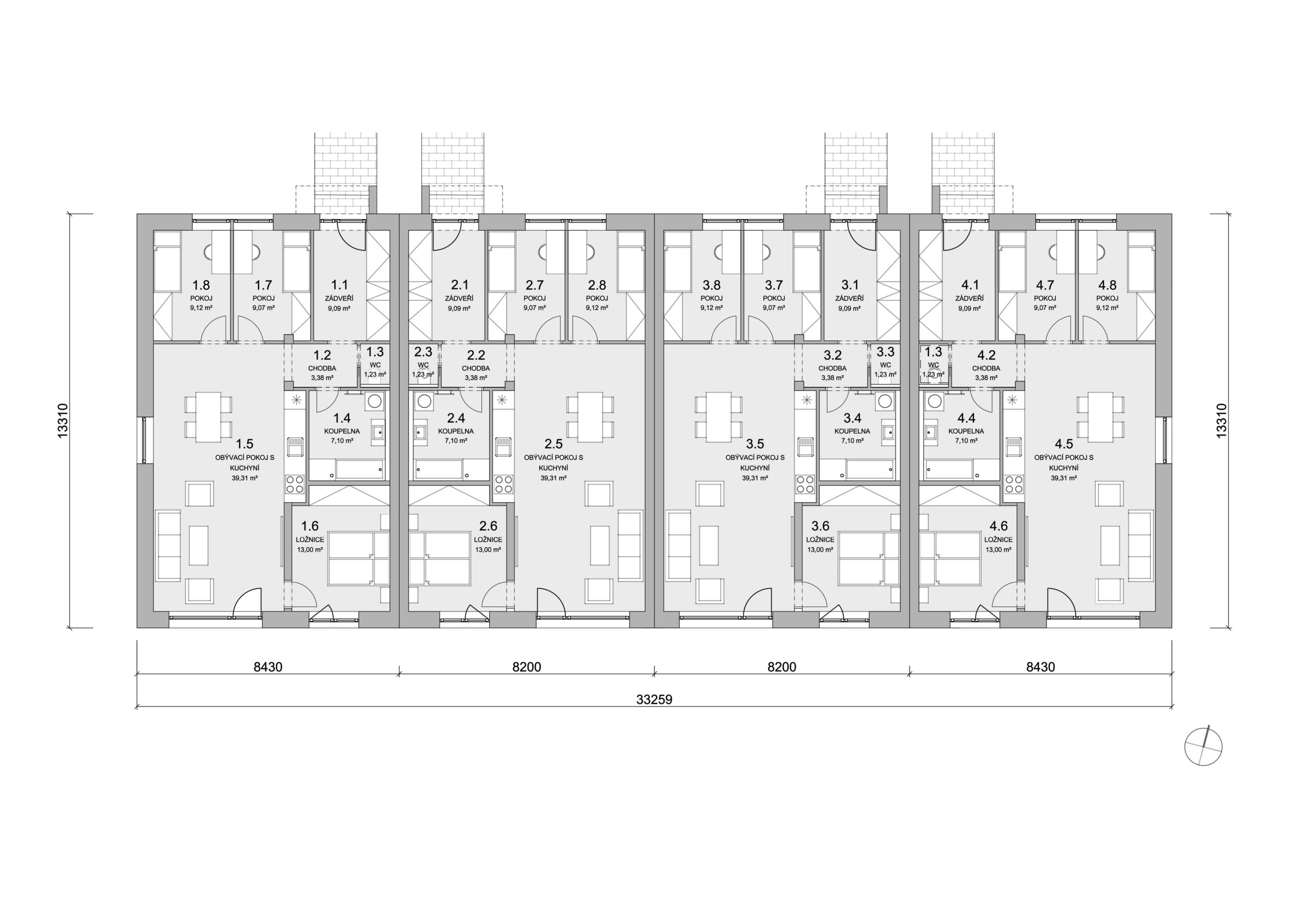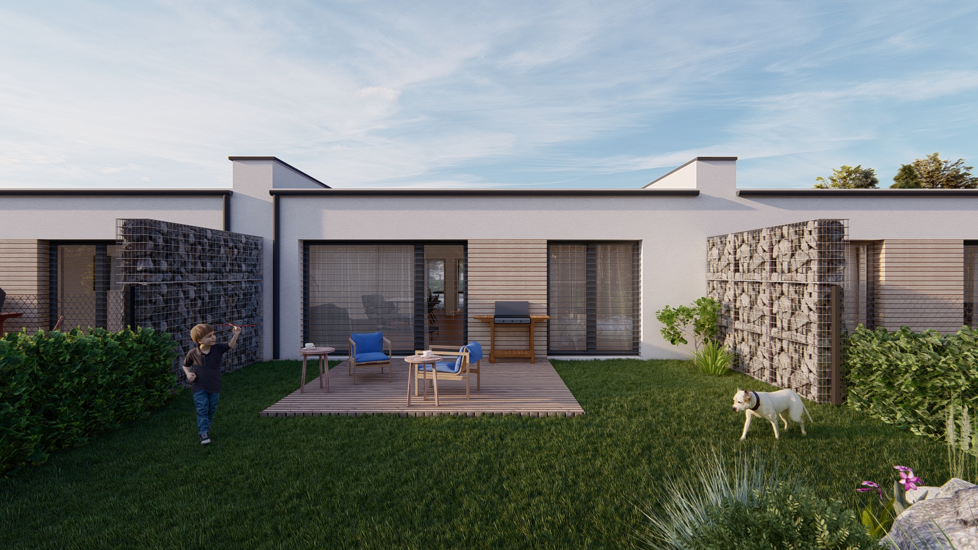 Domy jsou dispozičně řešeny jako 4+kk. Najdete zde 4 pokoje, prostorný obývací pokoj s kuchyňskou linkou, 2 dětské pokoje a velkou ložnicí se vstupem na terasu. Dále koupelnu, toaletu a úložné prostory.